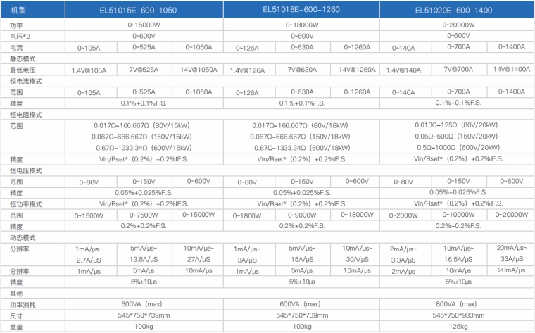 EL51000E系列大功率电子负载有150V、600V、1200V三种电压范围,功率范围由2kW至48kW、单一台的最大电流可达2000A;通过并联扩展,最大功率更可达240kW。 EL51000E系列负载具有高功率密度、高控制和测量精度、高性价比“三高”特点;同时本系列负载具备同步动态,并联扩展等功能,更有瞬间提供三倍额定功率功能,EL51000E系列负载支持恒电压CV、恒电流CC、恒电阻CR、恒功率CP四种传统静态加载模式,更支持恒电压CV+恒电流CC、恒电阻CR+恒电流CC、恒电压CV+恒电阻CR三种复合加载模式。 产品主要是供服务器电源、A/D电源供应器、功率电子元件、动力电池、车载充电机OBC/DD模块、直流充电桩模块、直流充电桩、电流器件(继电器、保险丝、连接器)等产品测试使用。广泛应用于电源供应器、动力电池、新能源汽车、直流充电桩、民用航空、科研院校等多种领域,是专用模拟各类高功率产品负载变化的高精度仪器。 产品特点 1.高速动态负载,最高频率达 50kHz 负载波形模拟功能 2.电压范围 : 150V、600V、1200V 3.电流范围:最高达2000A 4.低压带载特性:0.5V 即可加载电流 5.主/从并联控制,并联数量高达10台 6.使用者自订波形(UDW) 7.高达50kHZ的自动变频动态扫描(Sweep) 8.即时的电源供应器负载暂态响应模拟及电压峰值(Vpk+/-)量测 9.瞬间过功率拉载功能 10.短路模拟功能 11.可透过前面板直接编程255组时序 12.电池放电模拟和量测放电时间功能 13.快速 OCP 测试功能可编程切换多组负载 14.高精度电压、电流和功率量测 15.ARM 控制技术,通讯速度快 16.具有过压、过流、过功率、过温度、反向保护功能 17.配备RS232通讯接口,可选配RS485/GPIB/LAN/CAN通讯接口 18.环境温度:-20℃-40°C 19.智能风扇控制 产品应用 提供四种静态加载模式:恒电流模式(CC)和恒电阻模式(CR)适用于传统开关电源负载仿真,恒电压模式(CV)适用于电池充电机及恒流输出电源负载仿真,恒功率模式(CP)可作为动力电池组和储能装置负载的模拟。