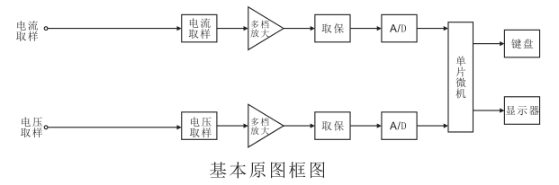 如图所示,仪器由模拟部分和数字部分组成。模拟部分主要由传感器、多档程控放大器、采样保持器、A/D等电路组成.数字部分含微型计算机数据存储器、键盘和显示器组成。 被测电压信号通过电压传感器后,信号降低为弱信号,根据信号大小,由微型计算机控制,进行程控多量程放大,并通过采样保持器,由模拟/数字转换器A/D把电压信号转换成数字信号,并把数字传输至微型计算机,计算出电压真有效值(URMS)并把数值输出到显示器显示。被测电流信号通过电流传感器后,信号转换为弱电压信号,同被测电压一样,经过多档选择程控放大、采样保持、A/D转换,在微型计算机里计算出电压真有效值(IRMS)并把数值输出到显示器显示。 技术参数