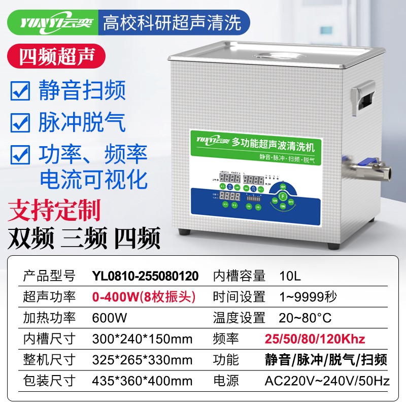 1.型号:YL0810-255080120(数码按键款/四频可调/底振式) 2.内槽尺寸:长300mm*宽240mm*高150 mm; 3.外型尺寸:长325mm*宽265mm*高330 mm; 4.超声波额定功率:0-400W(安装8个50W振头)加振款(10%-100%可调) 5.超声波额定频率:25/50/80/120kHz 6.加热额定功率:600W 7.温度控制:数码显示控制(常温-80°C可设置) 8.时间控制:数码显示控制,精确到秒(1-9999秒可设置) 9.容量约:10L(4分排水阀) 10.清洗机内槽采用T1.5mm厚优质不锈钢材质冲压成形、无缝焊接,外壳采用防指纹不锈钢板包装,美观耐用,整机304不锈钢(包括内槽、壳体、阀体、管路); 11.电源要求:AC220V 50HZ 12.标配不锈钢清洗篮、不锈钢防尘盖、电源线等等 超声波清洗中草药当归的清洗工艺参数选择 当归为典型的根类中草药,可药食两用,采挖时可能会带有大量泥土、病原生物及虫卵等,在深加工、贮藏和运销前必须进行清洗,过去传统的清洗方法包括人力刷洗、滚筒洗涤或高压水射流等。采用人力刷洗,洗刷质量好,相比用水量和药效成分流失较少,但工作效率低下,耗时费力;滚筒洗涤借助于滚筒的转动带动滚筒内部药材翻动,迫使药材互相撞击振动,进而使附着药材表面的污染物向清洗液分散以及高压水流冲洗过程中要对药材翻动,同时连续进行冲淋。滚筒清洗和高压水射流清洗快速高效,但清洗过程对药材损伤较大,同时消耗大量的水。并且当归表面出现皱缩干,那些污垢藏于缝隙或深处便难以清洗,清洗效果大打折扣,后续加工贮藏受影响。 用于中草药当归清洗,主要是利用其在液体介质中传播时产生的空化效应,对物体表面的污物进行撞击、剥离,完成清洗过程。空化效应能够明显减弱液体表面张力及摩擦力,对污物层进行直接反复多次冲击,并使污物在空化产生的能量作用下被粉碎、形体改变、细化,垢物微粒团间的亲和力降低。破坏固液界面附面层,直至最后脱落,达到普通机械搅动所达不到的清洗效果。并且超声波清洗机不会对当归的成分有破坏,还有杀毒灭菌效果。 根据文献《超声波清洗中草药当归的初步研究》清洗当归的试验参数,频率、功率、清洗时间和清洗液及其温度,清洗液采用自来水洗后当归的清洁度为考核目标。参数如下: 功率250W、40kHz的中频超声波清洗机清洗干燥当归得出的结论可为当归及其他根茎类干药材超声清洗提供参考。 当水温(25~60℃之间)越高,达到洁净度要求所需时间越短。水温60℃时清洗时间最短,并且超声空化最活跃的温度为60℃相一致。只要将水加热到超过30℃,清洗30分钟以上即可达到清洗目的(清洁度在4级以上)。 在当归的实际加工中,若需要快速清洗,就要适当提高水温,若后续工序较慢,则可免加热清洗,在25℃(室温)下超声波清洗60分钟左右就可达到4级及以上清洁度,如此既节水节能又可保证当归有效成分基本无流失。 超声波清洗技术为中草药当归提供了一种高效、节水、节能且能保持药效成分的清洗方法,并且也可适用于其他根茎类药材清洗。 用户评论 产品评分 目前评分共0人 产品质量