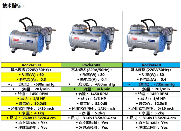 无油式真空泵 品牌:中国中国台湾洛科Rocker 型号:Rocker410 Rocker410产品特色 ◆ 无油雾污染、免保养 ◆ 进气过滤装置 系列真空泵每个机种在进气口均装有滤芯,可过滤粉尘、水气,以净化进气,延长汽缸及活塞的使用年限。 国际认证 ◆ 欧盟 CE 安全认证 产品应用 ■ 微生物检测 订购资讯 167410-22 无油真空泵 200-240v/50Hz (可提供100-120v/60Hz的规格) 基本规格 (220V/50Hz) : ◆ 功率(W):80 产品特色 : ◆ 无油设计,不需使用润滑油或保养 ◆ 机器本身有过热保护装置 ◆ 仪器本身提供2年免费零件服务 ◆ 欧盟 CE 安全认证 ◆ 北美 CSA 安全认证 ◆ IP 30 防护等级