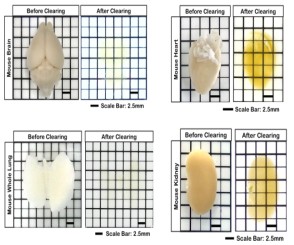 2、组织透明化 透明化适用于各类型生物组织,可以实现从细胞到整鼠样本的快速高效透明化,覆盖各类型研究场景。 基于内源性标记/小分子药物探针标记的全鼠透明化