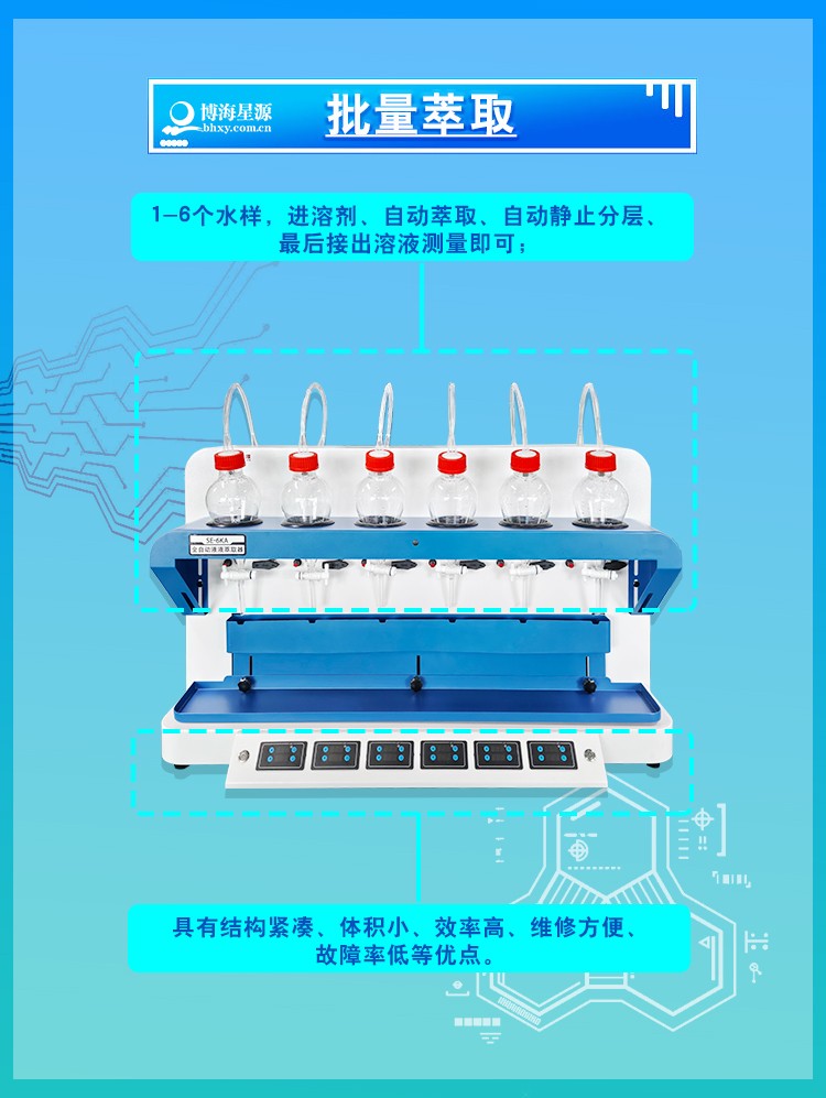在日常化验工作中,传统萃取常采用震荡或分液漏斗手摇方式,这类方法操作不便、效率较低、劳动强度大,且所用溶剂可能对实验人员健康产生影响,SE-6KA