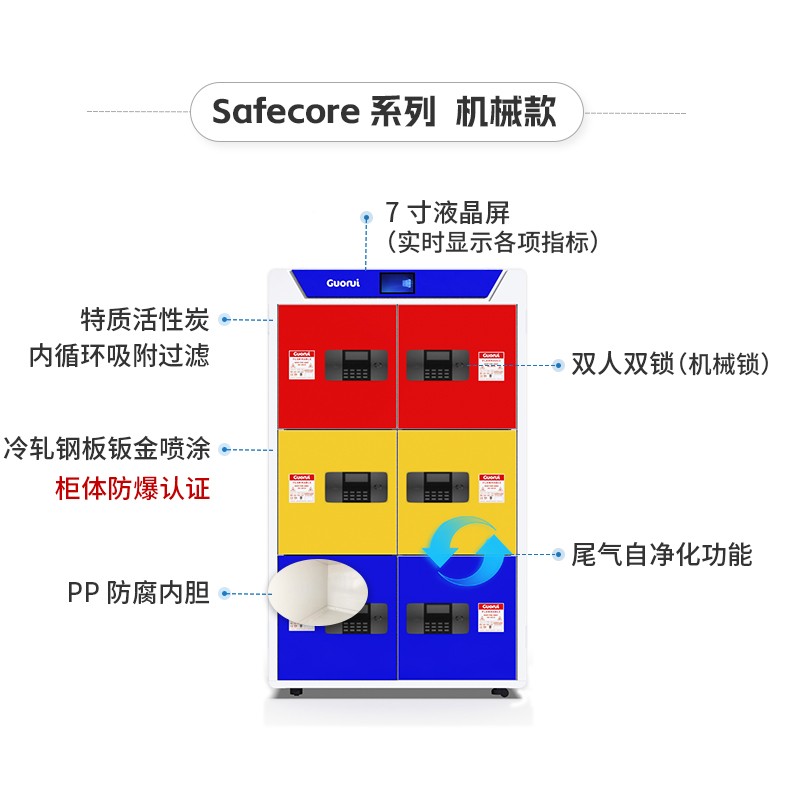 safecore系列净气型防爆危化品柜可用于实验室(科研院所、高校、企业研发中心)、工业生产(石油化工、制药、半导体、新能源)、 医疗领域(医院、检验中心、疾控中心)、教育领域(中小学、职业院校的化学实验室)等领域。该系列通过国家防火防爆认证,配备安全机械锁,实现双人双锁管理!产品分为双门柜、四门柜、六门柜、八门柜,不同颜色存放不同类别的危化品,根据您的需求细化您的选择!