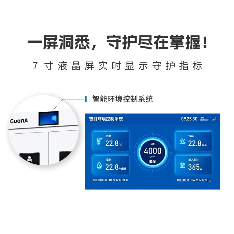 2. 实时显示柜内各项指标:温度、湿度、风机转速、VOC、滤芯剩余天数;