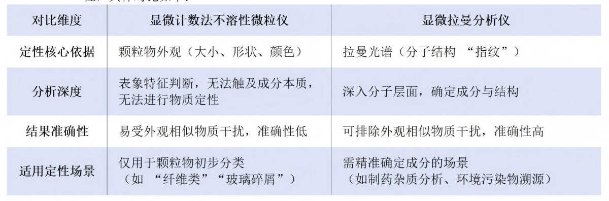 二、关键性能维度对比:不具备替代可行性 从定性分析的核心需求出发,二者在关键性能上的差异直接决定了替代的不可行性,具体对比如下: 三、不能替代的深层逻辑:功能定位与行业需求 二者的功能定位从设计之初就存在本质差异,且行业应用需求进一步强化了这种 “互补而非替代” 的关系。 1. 技术原理决定功能边界:显微计数法不溶性微粒仪的设计核心是 “计数”,定性仅为附加的初步判断功能;显微拉曼分析仪的设计核心就是 “定性”,技术方案围绕 “精准识别成分” 展开,二者的核心目标不同,无法跨边界替代。 2. 行业需求无法通过单一仪器满足:在实际应用中,二者常需配合使用而非替代。例如,制药行业中,先通过显微计数法不溶性微粒仪统计注射剂中微粒的数量与大小,再针对异常微粒(如数量超标),用显微拉曼分析仪确定其成分(如是否为原料杂质、容器脱落物),二者形成 “量 - 质” 结合的分析体系。 3. 定性精度差距无法弥补:对于需要严格定性的场景(如半导体行业的芯片污染物分析、药品行业的异物溯源),仅靠外观判断的显微计数法不溶性微粒仪无法满足精度要求,必须依赖显微拉曼分析仪的精准定性能力。