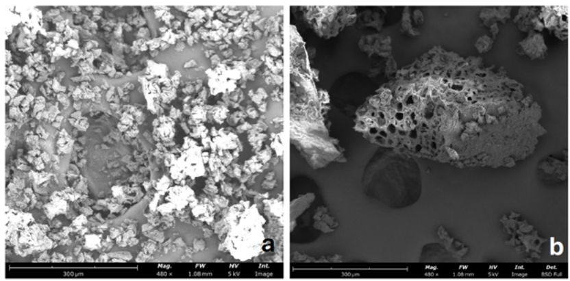 图6:在固结应力不断增加的情况下, 中度烘焙咖啡粉细磨的剪切单元结果 这一原理可与咖啡压粉和冲泡过程联系起来:压粉可增加咖啡粉的固结应力,改善其流动方程,并确保冲泡过程中水流均匀分布,从而实现更好的萃取效果,煮出质量更稳定的咖啡。 烘焙试验: 探索中度和深度烘焙咖啡的粗研磨 图7中的扫描电镜(SEM)图像显示,由于咖啡豆在烘焙过程中发生膨胀,深度烘焙咖啡粉的孔隙率通常更高。这种孔隙率的增加在SEM图像中表现为孔隙更大、更多(图7b)。相比之下,中度烘焙的咖啡粉孔隙更少、更小(图7a)。
