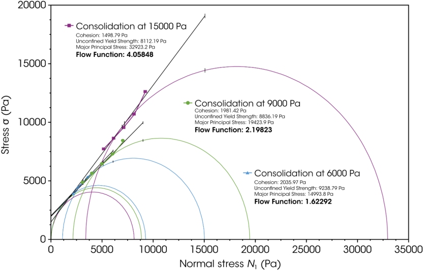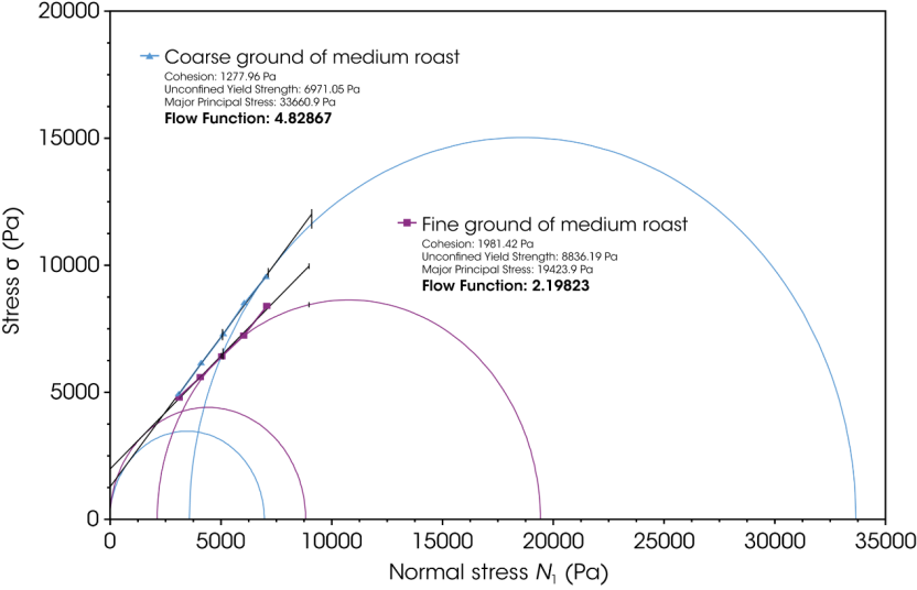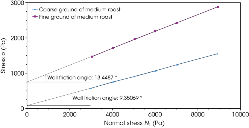图5:中度烘焙咖啡细粉和粗粉的剪切试验结果 (固结应力9000Pa) 剪切流动试验通过对粉床施加一系列固结应力,并测量流动起点的剪切应力,来测量内聚力和流动方程。内聚力反映了粉末的内部强度,而流动方程则描述了固结应力和内聚强度之间的关系。图6显示,随着固结应力的增加,细粉的流动方程会上升。这种上升可能是由于颗粒间的相互作用和致密化增强,导致其从内聚流动状态转变为易流动状态。
