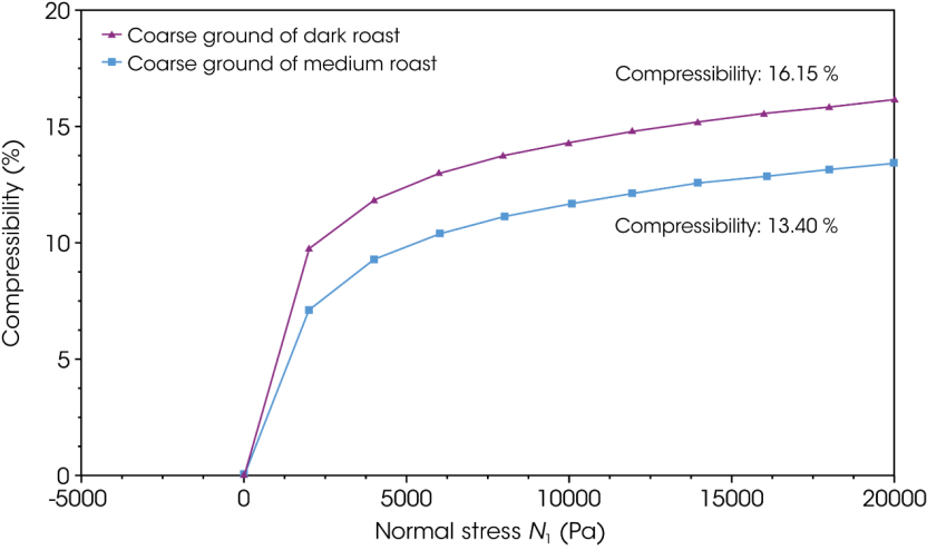 图8:中度和深度烘焙咖啡粗粉的可压缩性 在图9中,我们观察到深度烘焙咖啡的受限流动能稍高,这可能是由于其形状更不规则(如SEM图像所示)以及表面含油量增加所致。