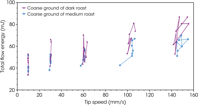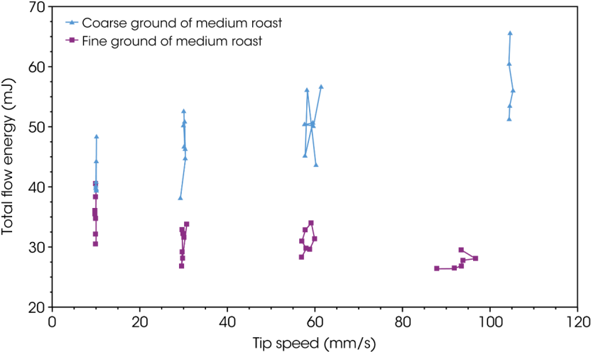 图3:中度烘焙咖啡粉细磨和粗磨的可压缩性 如果细磨咖啡粉的可压缩性明显高于粗磨咖啡粉,这会对咖啡的填压和冲泡过程均产生影响。细磨粉的可压缩性更强,在压力作用下会紧密堆积,形成密度更大的粉饼。此外,细磨粉的可压缩性较高,会减缓水流速度,增加接触时间,并可能导致过度萃取,从而使咖啡尝起来带有苦味。相反,粗咖啡粉的可压缩性较低,水流速度较快,接触时间较短,通常能冲泡出更清淡、口感更均衡的咖啡。 填压:受限流动能和压缩 填压或粉饼成型过程中的粉体运动会受到受限流动能的影响。受限流动能的结果揭示了一个有趣的规律:对于粗磨咖啡,受限流动能随着转子尖端速度的增加而增加,而对于细磨咖啡,受限流动能则随着尖端速度的增加而减少(见图4)。